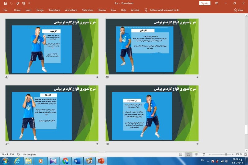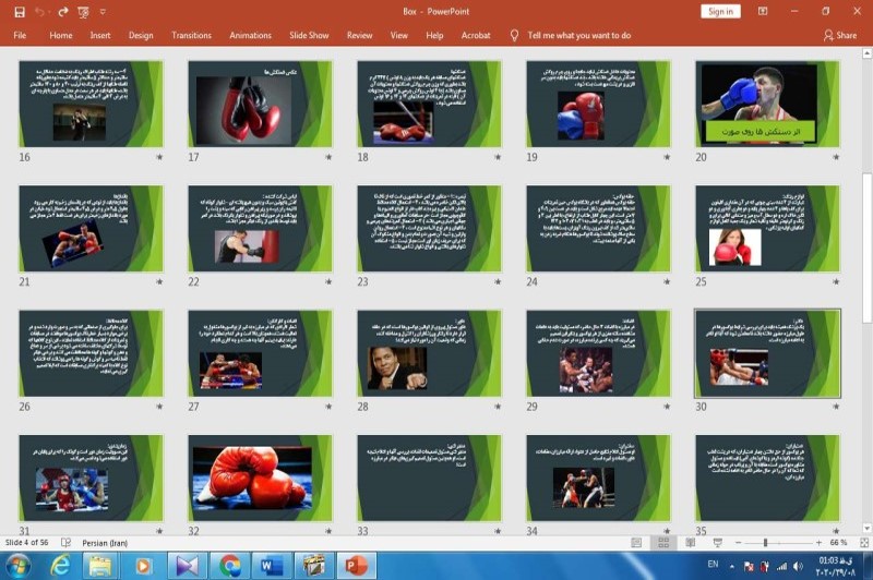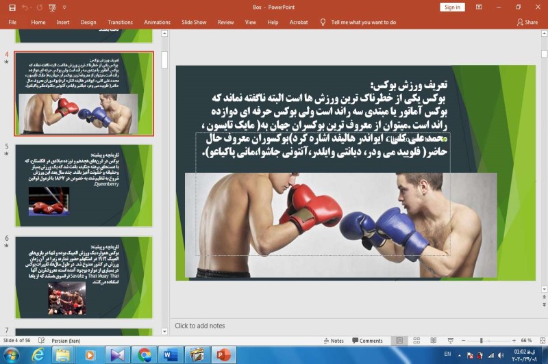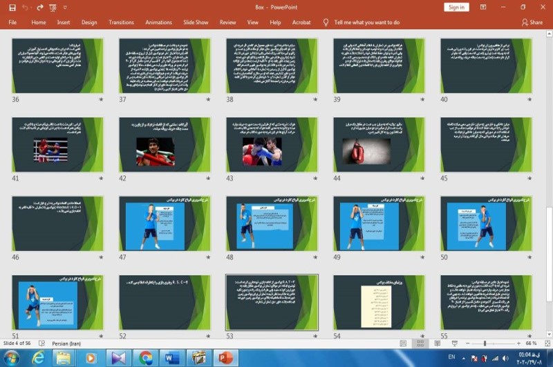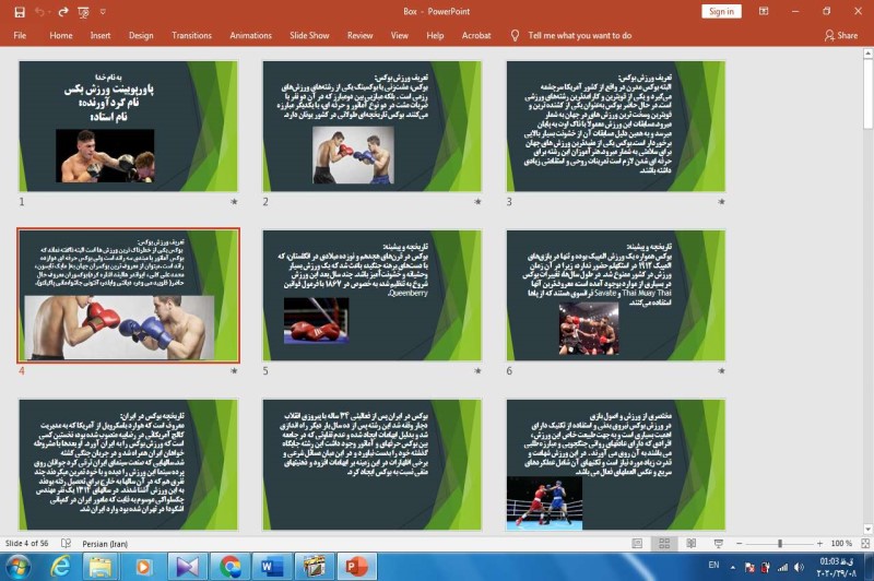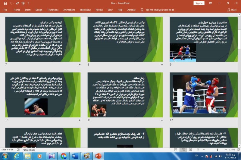 در این فایل دهها تصویر حرفه ای نیز در کنار متون کار شده است که در جذابیت آن بسیار کمک می کند. لازم به ذکر است فایل طوری طراحی شده که در صورتی که 56 صفحه برای شما زیاد بود بتوانید به راحتی و بدون اینکه به اصل پاورپوینت ضربه ای بخورد تعدادی از صفحات را حذف نموده و صفحات را به بیست یا سی صفحه یا هر مقدار که بخواهید برسانید. این پاورپویینت کاملترین پاورپویینت ورزش بوکس در سرتاسر جهان اینترنت می باشد.