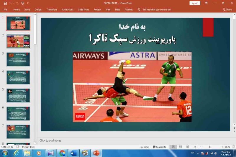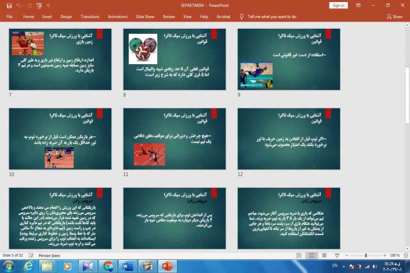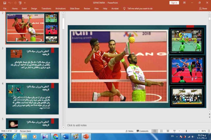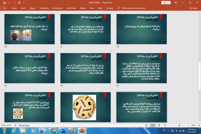 فایلی که ملاحظه میکنید پاورپوینت ورزش سپک تاکراست که در 32 اسلاید به بهترین شکل ممکن این ورزش را شرح داده است
